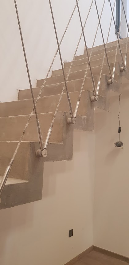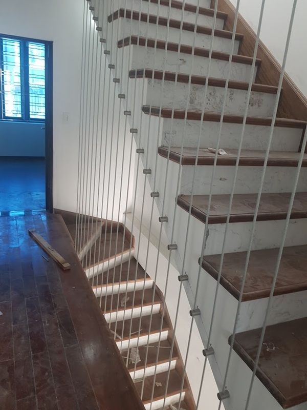 - Do cầu thang cáp được lắp dọc thẳng từ trên xuống dưới nên mỗi đoạn dây cáp được lắp với 1 bộ phụ kiện riêng gồm tăng đơ, trụ kính và thông tầng ( nếu có). Thông thường mỗi bậc cầu thang sẽ lắp 2 sợi cáp đảm bảo sao cho dây cáp cách nhau 10cm/sợi vừa đảm bảo an toàn vừa đảm bảo tính thẩm mỹ không bị quá rối mắt. Như vậy từ số bậc cầu thang tầng 1 ta sẽ xác định được số đoạn dây cáp cần lắp để mỗi đoạn này sẽ được kéo thẳng từ trên xuống dưới