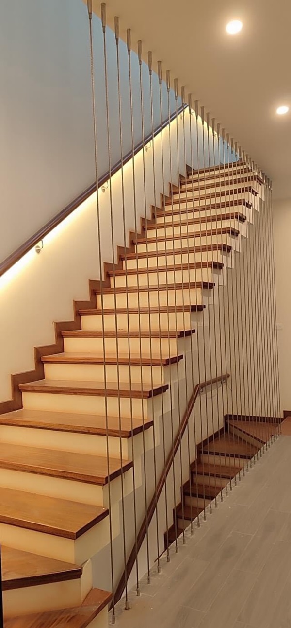 Cầu thang bằng dây cáp được tạo nên từ việc lắp đặt những bậc thang gỗ, ốp đá, bê tông lắp đặt với các phụ kiện cáp chuyên dụng và dây cáp treo bằng inox không gỉ. Với đặc thù này, nó tạo ra khe hở thông thoáng đón gió và ánh sáng tràn vào không gian ngôi nhà, tràn đầy năng lượng, dễ chịu.