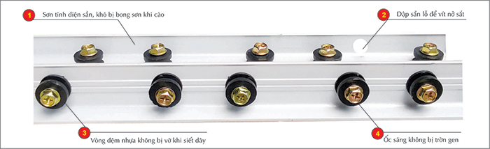Thanh nẹp nhôm định hình Có cấu trúc tạo chữ L, một mặt khoét lỗ để bắt ốc vít khi thi công, một mặt khoét lỗ đốt sắt có vòng nhựa đen gọi là bu lông có khoảng cách đều nhau 5cm/ bulong. Thanh nẹp được làm từ hợp kim nhôm cao cấp, chuyên dụng, bề mặt phủ một lớp sơn tĩnh điện chống han gỉ, chắc chắn thẩm mỹ cao, dễ dàng vệ sinh lau chùi.