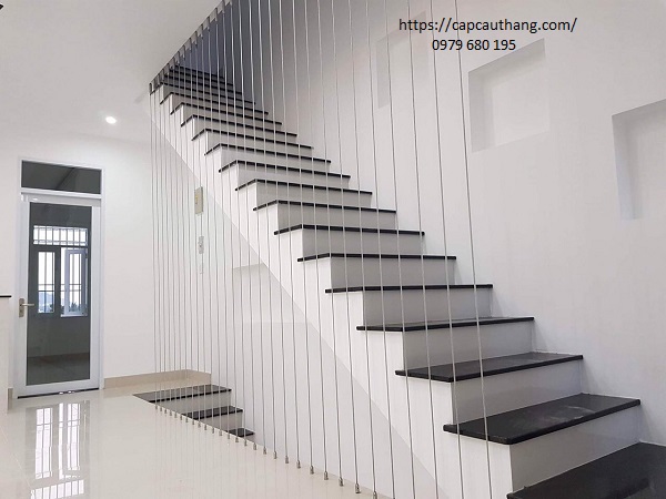 - Dây cáp cầu thang: Cáp được làm bằng inox, có 2 loại là cáp inox bọc ngoài bằng lớp nhựa PS và cáp inox trần, được thiết kế một đầu neo vào bậc thang, một đầu neo vào trần nhà. Thông thường mỗi bậc thang sẽ được bố trí 2-3 sợi cáp, cách đều nhau khoảng 5-10cm, vừa có tác dụng chịu lực vừa đóng vai trò là một tấm lưới an toàn che chắn không để người rơi khỏi cầu thang, loại bỏ xảy ra sự cố. Lớp vỏ bọc PS giúp cách điện và tạo sự mềm dẻo cho sợi cáp, tránh gây xây xát khi xảy ra va chạm, do đó đảm bảo an toàn tuyệt đối cho người sử dụng.