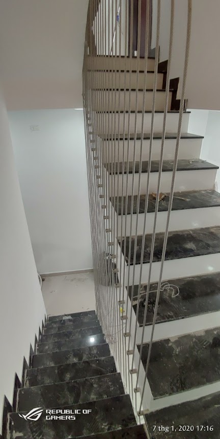 - Dây cáp cầu thang: được làm bằng inox 304, bọc ngoài bằng lớp nhựa PS, được thiết kế một đầu neo vào bậc thang, một đầu neo vào trần nhà. Thông thường mỗi bậc thang sẽ được bố trí 2-3 sợi cáp, cách đều nhau khoảng 8-10 cm ( hoặc theo yêu cầu của chủ nhà) , vừa có tác dụng chịu lực vừa đóng vai trò là một tấm lưới an toàn che chắn không để người rơi khỏi cầu thang, loại bỏ xảy ra sự cố. Lớp vỏ bọc PS giúp cách điện và tạo sự mềm dẻo cho sợi cáp, tránh gây xây xát khi xảy ra va chạm, do đó đảm bảo an toàn tuyệt đối cho người sử dụng.