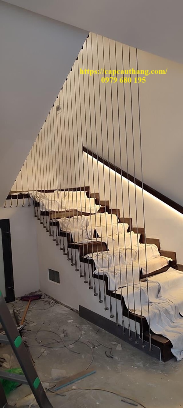 Cáp cầu thang được kéo từ tầng trên cùng xuống dưới. Một đầu sợi cáp lắp tăng đơ để duy trì độ căng. Còn đầu kia được cố định vào vít nở sắt và lắp chắc chắn vào bản dốc hoặc phần dầm chiếu nghỉ cầu thang. Nhờ vậy mà loại cầu thang dây cáp luôn đảm bảo độ an toàn khi lên xuống.