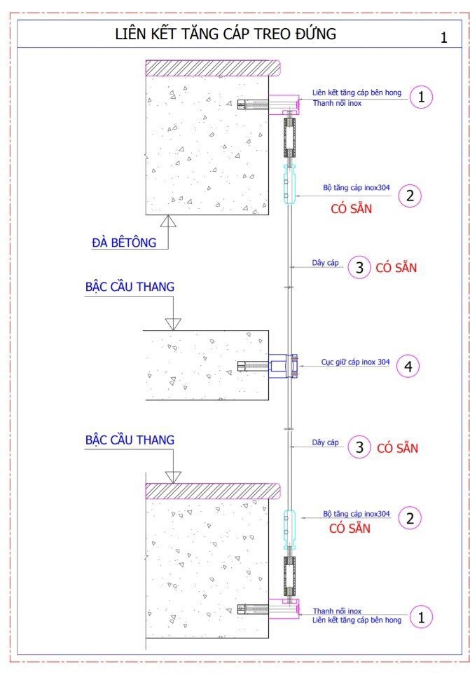Bước 3: Sử dụng các phụ kiện giữ cáp như móc giữ cáp, trụ kính, thông tầng, bu lông, ốc vít… vào mặt bên của các bậc thang cầu thang.