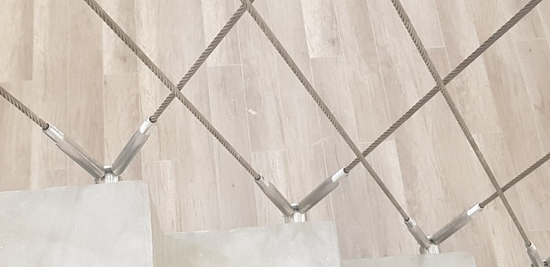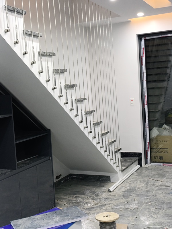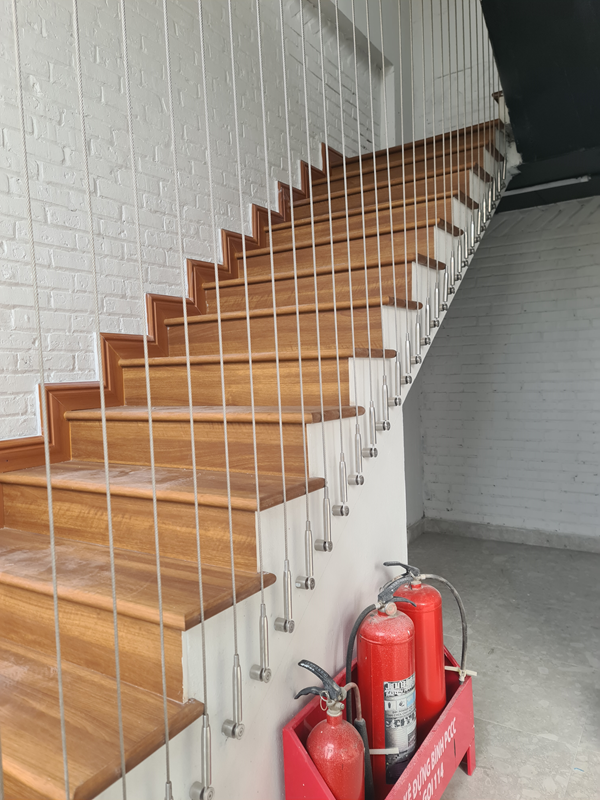 Thông thường mỗi bậc thang sẽ được bố trí 2-3 sợi cáp, cách đều nhau khoảng 8-10 cm ( hoặc theo yêu cầu của chủ nhà) , vừa có tác dụng chịu lực vừa đóng vai trò là một tấm lưới an toàn che chắn không để người rơi khỏi cầu thang, loại bỏ xảy ra sự cố. Lớp vỏ bọc PS giúp cách điện và tạo sự mềm dẻo cho sợi cáp, tránh gây xây xát khi xảy ra va chạm, do đó đảm bảo an toàn tuyệt đối cho người sử dụng.